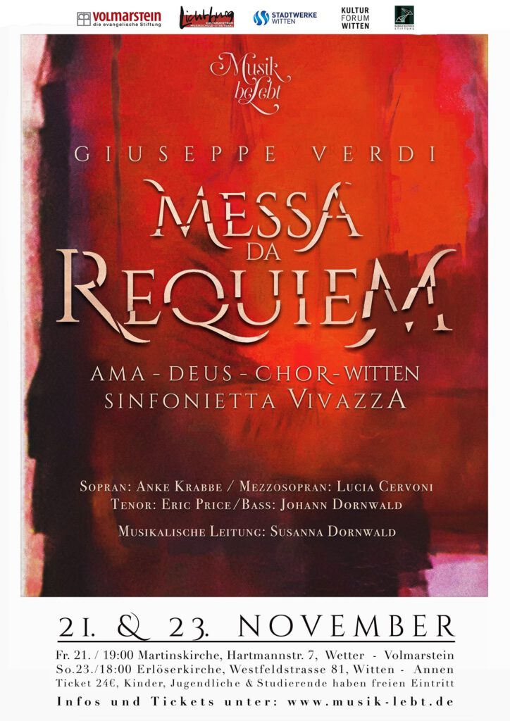 Der durch erfolgreiche Konzerte wie Bachs „Matthäuspassion“ und Händels „Messiah“ bekannte Ama-Deus-Chor Witten, Mitglieder des Barockensembles Ama-Deus und namhafte Solisten führen am Totensonntag, 24.11.2019, Vivaldis „Gloria“ (RV 589), Händels „Dixit Dominus“ (HWV 232) und Arvo Pärts „Stabat Mater“ auf. Die drei Werke bilden einen starken Spannungsbogen: Ein Bogen-Ende ist der jubelnde Lobpreis Gottes und seiner furchteinflößenden Herrschaft, das andere ist inniges Beten und Meditation, u.a. beim Betrachten des Sterbens Christi durch die Augen seiner Mutter.